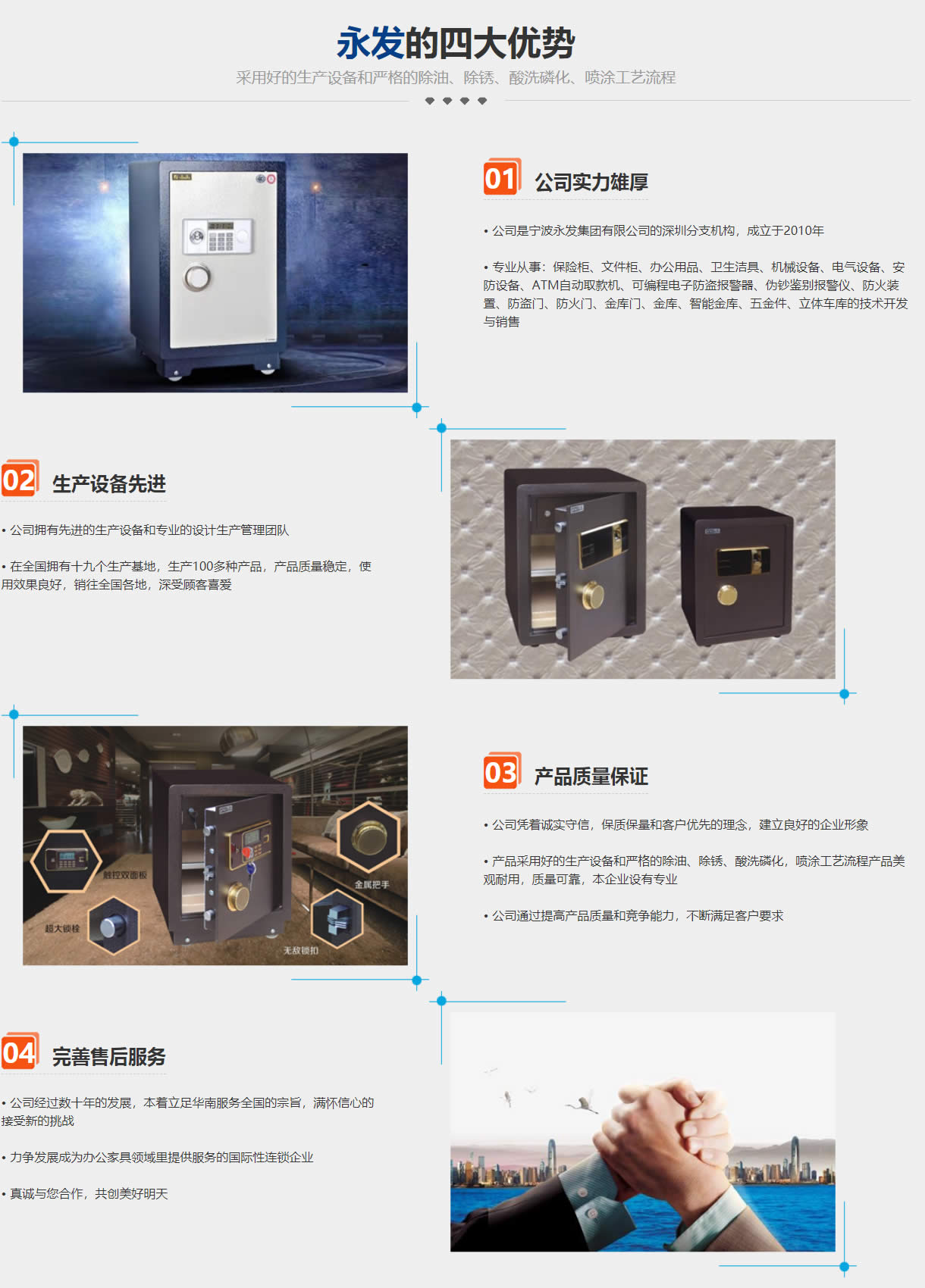 深圳永發(fā)安防產(chǎn)品有限公司 深圳永發(fā)安防產(chǎn)品有限公司,是寧波永發(fā)集團(tuán)有限公司的深圳分支機(jī)構(gòu),成立于2010年,專業(yè)從事:保險(xiǎn)柜、文件柜、辦公用品、衛(wèi)生潔具、機(jī)械設(shè)備、電氣設(shè)備、安防設(shè)備、ATM自動取款機(jī)、可編程電子防盜報(bào)警器、偽鈔鑒別報(bào)警儀、防火裝置、防盜門、防火門、金庫門、金庫、智能金庫、五金件、立體車庫的技術(shù)開發(fā)與銷售。